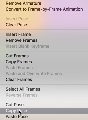 Most conveniently, this menu allows an easy way to copy and paste poses across frames. Note that in order to use this feature, you must have selected a frame which includes a pose in order to copy it from this menu.