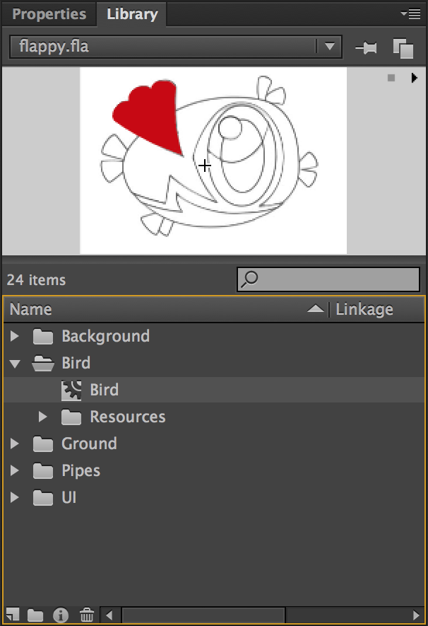 A version of the document containing the finished artwork that we’ll be working towards can also be found within the repository at start/flappy-artwork.fla. Feel free to use this version of the FLA as a reference at any point during the tutorial.