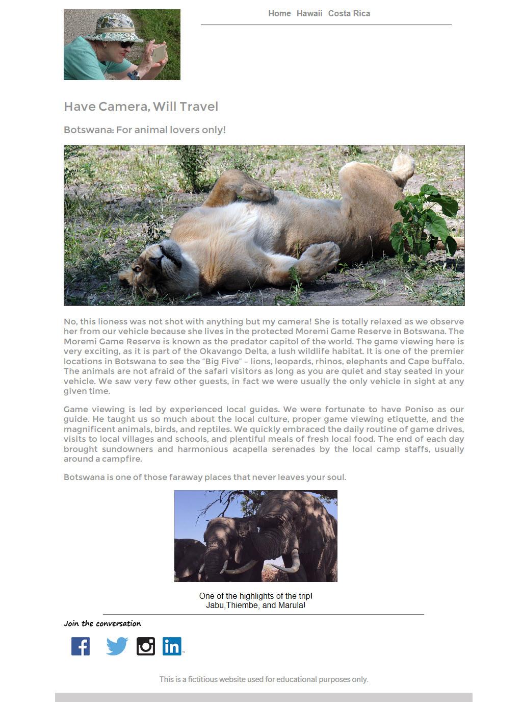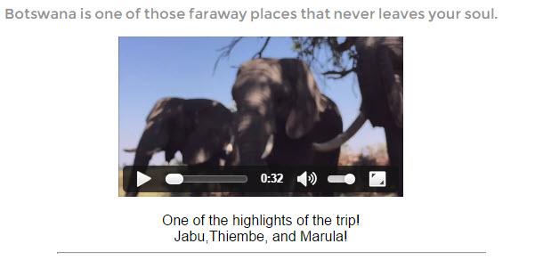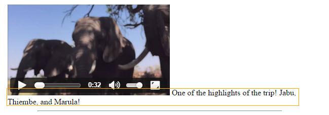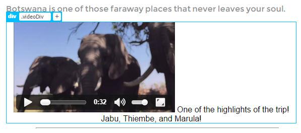 The easiest way to insert and position a video on a page is to place it in a div tag. The div tag can then be assigned a class or ID that can then be used to style and place the video content on the page. The video we are going to add to the index page is a video of playful elephants in an elephant rescue center in Botswana.