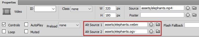 Add the elephants video with the ogg file extension in the Alt Source 2 text box.