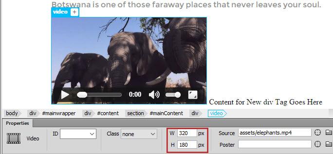 With the Video Placeholder selected, select the Browse for File button next to the Source text box in the Property inspector, then browse to find the file elephants.mp4 located in the website assets folder. (If you don’t see the Property inspector, select Window on the Menu bar, then select Properties.)