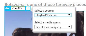 Select the Add Class/ID button in the Element Display, type videoDiv for the Class name, press [Enter] (Win) or [return] (Mac), then select blogPostStyle.css for the source.