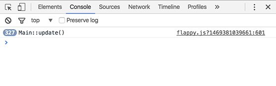 The Ground class’ update() method is now being called on every frame update along with the Main class’ update() method. However you won’t see anything being traced to the JavaScript console because the ground’s update() method only writes to the console when scrolling has been initiated.