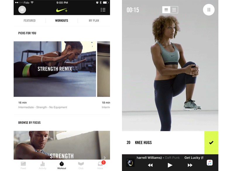 What I’m most impressed with is the in-workout experience. Nike has put a lot of thought into accommodating someone who is working out with their phone, and utilizes sound and video to make this much less awkward than it could be. The majority of the screen is taken up by a large, looping multi-angle instructional video that shows you exactly what you’re supposed to — and not supposed to — do. Voiceover prompts explain what to do for each move and encourage you to push harder. The main call-to-action is a bright green checkmark button that advances you to the next move. The workout ends with a satisfying completion screen that summarizes your efforts.