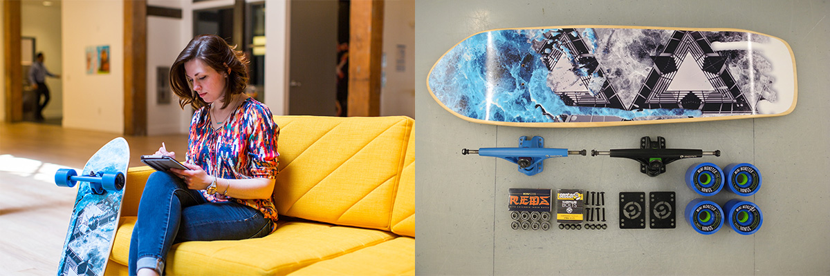 , from Erie, Pennsylvania, is a designer and a craftsperson who creates unique, custom longboards inspired by graffiti and skate culture, yet constructed under the care of an artist’s eye. During Burton’s residency, she will create her own line of signature longboards, focusing on material sustainability and quality, as well as her artwork messaging.