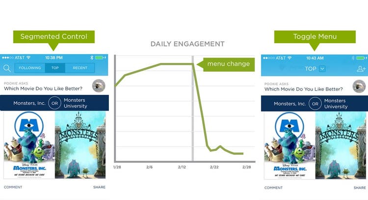 It’s tempting to rely on menu controls in order to simplify a mobile interface — especially on a small screen. But hiding critical parts of an application behind these kinds of menus could impair usage. Hidden navigation drives down engagement, slows down exploration and confuses people.