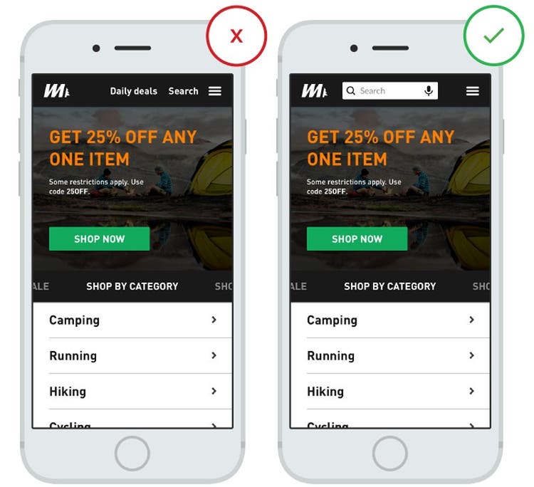 - Icons and other graphic elements should help users to understand the menu options. Think of the shopping-cart icon; it serves as an identifier to check out or view items. Users don’t have to think about how to navigate to make a purchase; this element directs them to the appropriate action.