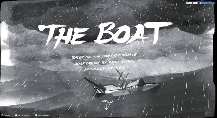 Parallax scrolling is also very effective in guided storytelling. When you want to tell a story in a smooth, linear fashion, pairing long scrolling with the parallax effect can create a completely immersive browsing experience. In The Boat, shown below, as users scroll, animations take them to the next screen while creating a path of content to follow. This turns scrolling into something more fun and makes the user wonder “What will happen next?”