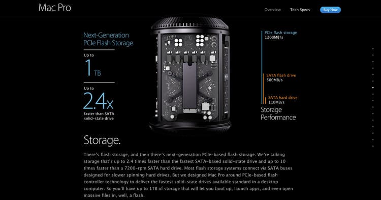 The problem can be seen on Apple’s Mac Pro page. No matter how fast you scroll, the layout moves at a predetermined speed. Because all content on this page is tied to scrolling, the visitor is forced to browse the page at a slow pace.