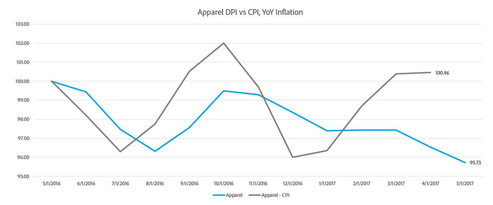In May, the DPI tracked -4.3 percent deflation year-over-year (YoY) in apparel. Over nearly the same period, the CPI, which measures prices in retail stores, saw relatively flat apparel inflation. “We think the difference reflects online shoppers’ dedication to seeking out deep discounts, and the fact that consumers are more likely to buy off-season clothes online,” explains Sid.