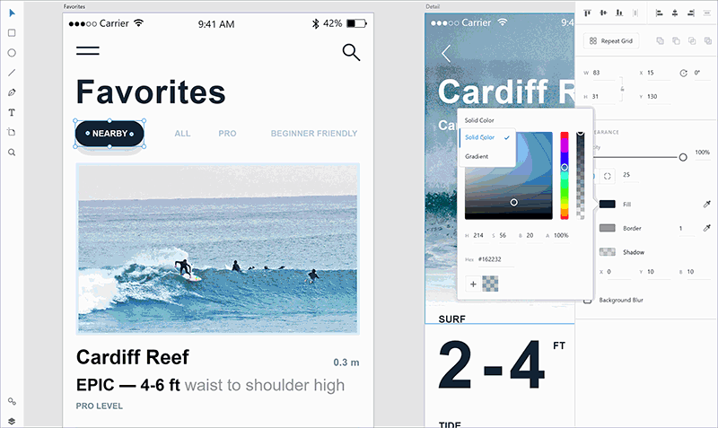 With this release, you can now create and edit linear gradients within vector objects in XD. What’s more: you can easily bring in existing gradients from Illustrator with simple copy/paste commands, color stops and all. To create a linear gradient, select the object you want to apply the gradient to, open up the color picker, and select “gradient” as the fill type. A gradient will appear, based on the existing color of the object. You can add, select, move, and delete color stops on the bar at the top of the pop-up to customize your gradient. Modify each stop color and transparency using the familiar color picker and appearance controls.