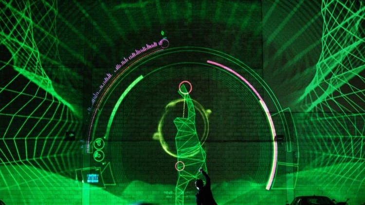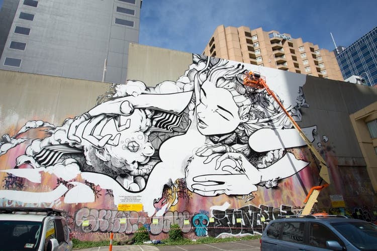 Graffiti artist Sofles has used traditional graffiti techniques with motion graphics and video mapping on a large scale mural to create Graffiti Mapped, an immersive layered multimedia experience for the White Night Melbourne cultural festival. The image illustrates the scale and physicality of the mural. A parking lot wall is the new cultural canvas.