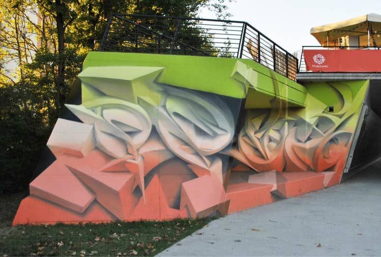 Graffiti and sculptor Peeta (a.k.a Manuel Di Rita) uses Photoshop, Illustrator and CAD software to create digital graffiti that is used to build 3D sculptures and murals that create depth and hyper realism to traditional street art. Exaggerated curves and angles are digitally modeled from sketches which are then constructed and integrated into physical locations. Traditional spray painting techniques for line work, light volume and shadows are used to give the installations a surreal, industrial look that challenges the viewer’s perception of depth and space.
