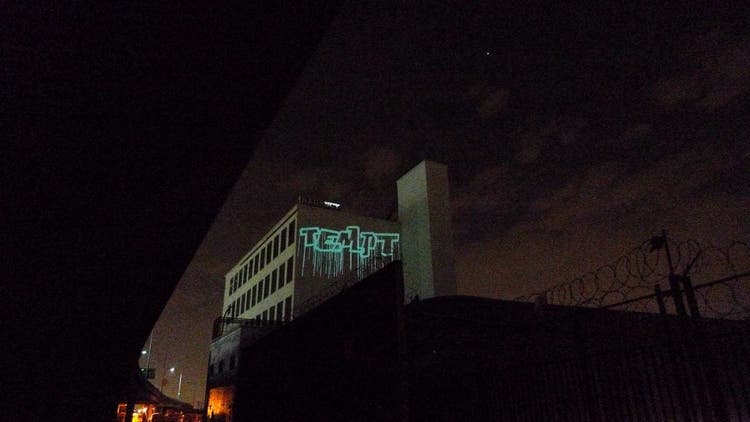 Additional work involving the merger of pixels and graffiti is being done by the Graffiti Research Lab. They are building open source tools to help artists grow digital street art and foster a social dialog in urban settings. Their Eyewriter Project empowered graffiti artist Tony Quan a.k.a. Tempt One, who is paralyzed due to ALS, to create unique projection graffiti art through eye tracking technology. The pieces are then visualized with lasers in gallery and urban settings.