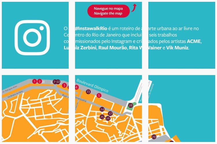 In order to promote tourism to the Rio Summer Olympics and to encourage visitors to explore the the Olympic Boulevard and Lapa District, Instagram created InstawalkRio, a self-guided urban art tour that highlighted the best murals and graffiti walls of Rio. The art tour encouraged Individuals to share their experiences on Instagram using the hashtag #InstawalkRio.