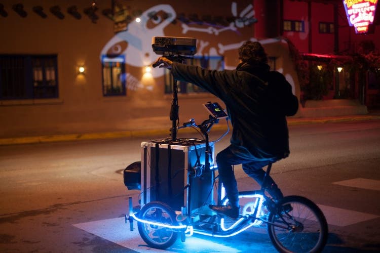 Using a portable camera, VJ Sauve brings projection mapping and storytelling into a group bicycling experience. Riders follow Sauve through the streets of Sao Paulo as animations are played on buildings and alleyways. The urban space becomes the canvas on which digital stories are told, enabling a shared experience of exploring and following the story while biking through the city streets.