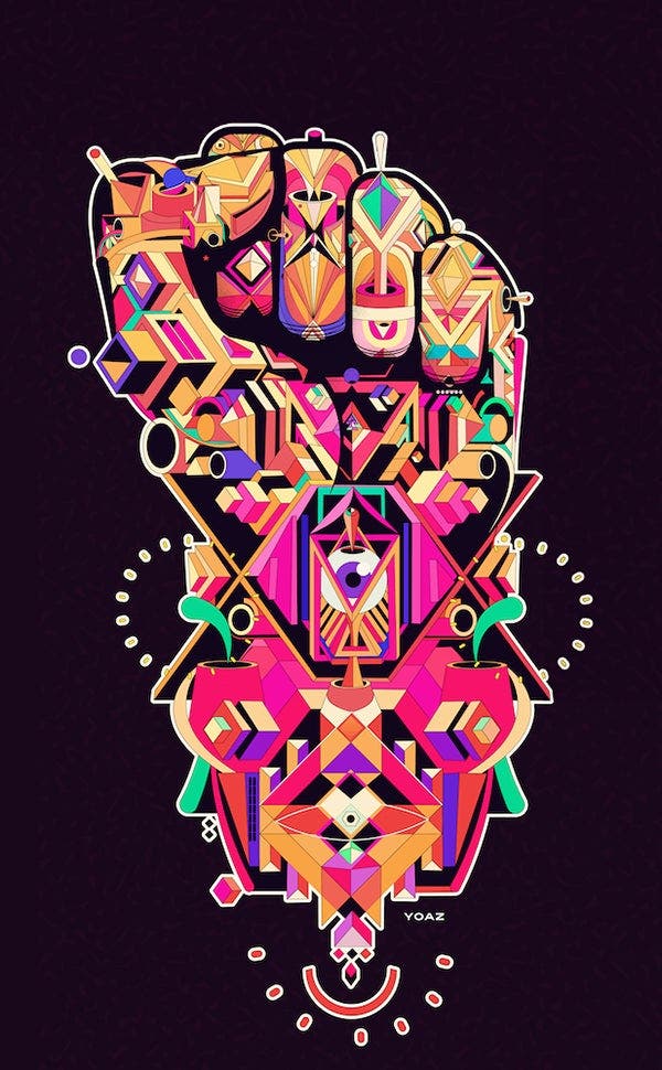 As with traditional Cubism, the best geometric designs are based on the real world. From patterns in nature to human faces, nearly everything can reflect geometric symmetry. Inspiration for new interpretations of geometry is everywhere. “Lately, I’ve been looking into tattoo art because many tattoo artists offer geometric interpretations of basic symbols or images.” Yo Az says. “I also find ideas often spring from looking at photos and examining street art.” The possibilities are endless.