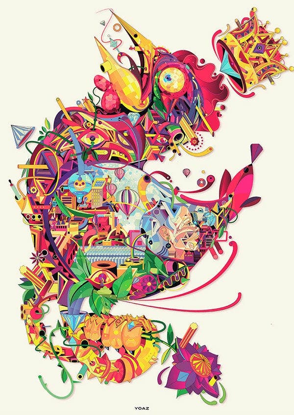 Designer Yo Az’s style is a modern take on this classic movement. His distinctive body of work uses geometric shapes to combine a colorful variety of shapes into vector images. He attributes the rise in popularity of geometric design to the rise in popularity of simple, minimalist themes. “Images that are clean and sleek convey a sense of modern elegance,” Yo Az says, “They indicate that whatever is being referenced in the design is on the forefront of the latest technology, and that draws people in.”