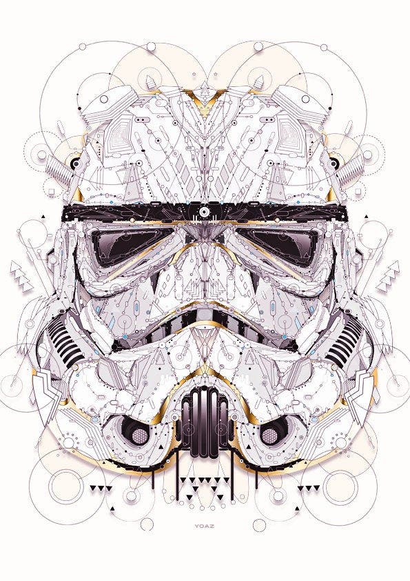 **Yo Az’s geometric designs often start with a recognizable image. For example, a Stormtrooper Mask from Star Wars. With this piece, he sat down and drew out the image by hand first, focusing on the most important lines to truly define the graphic. After he was satisfied with the outline, he scanned it into his computer and started adding his own personal touches. (Don’t have time to mess with a scanner? Try using Adobe Capture to easily digitize images and upload them to Adobe Illustrator.)