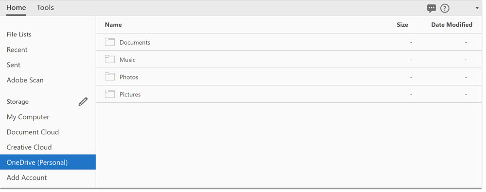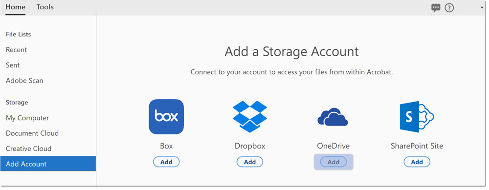 - Select **Add ** under the OneDrive icon to connect your files within Acrobat.
