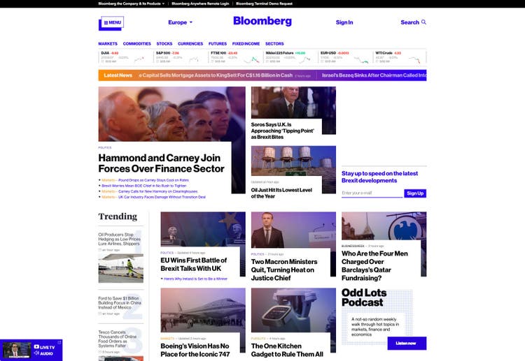 While gradients are often used as backgrounds for pages, they can work in smaller places as well – to capture user attention. Consider using a gradient as an accent in navigation, for a secondary image or for specific types of content. Smaller areas of gradient give you more freedom to play with this technique. For example, you could create visually interesting pairs of multicolor, as Bloomberg does:
