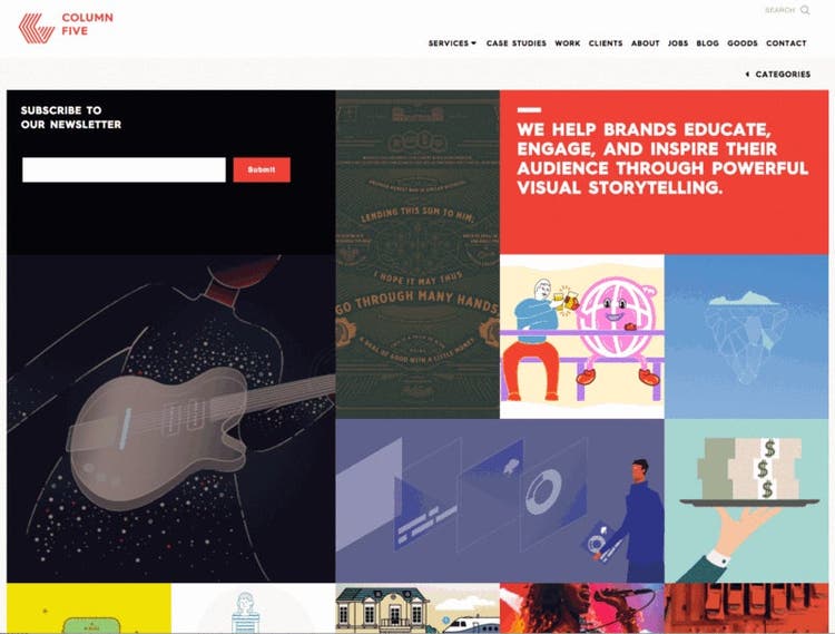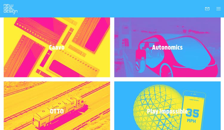 - A combination of bright colors creates a sense of happiness. The main visual for New Deal Design is striking, thanks to the bold color choice. It creates a friendly atmosphere and sets a positive mood.