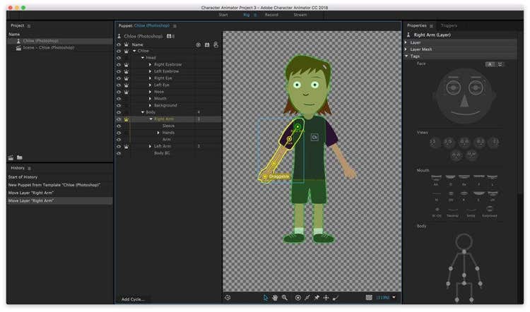 Rigging a puppet with independent parts is now more streamlined with automatic attachment of these independent groups to their parents (e.g., arms, legs, or other parts that overlap a torso or other part of a character). For newly imported artwork, position the group’s origin to where you expect it to attach–no more manual stapling or extra staple handles. New visualizations in the Puppet panel show how independent groups attach to their parent group’s mesh, which now includes a yellow outline to indicates the selected layer in the Puppet panel. A clipping mask lets you use the content of a layer to mask the layers above it. Use multiple layers in a clipping mask with successive layers.