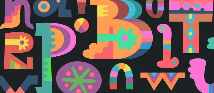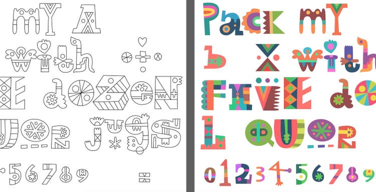 Despite the font’s whimsical designs, Matt was thoughtful about maintaining readability. The variation in size, coloring, and shape elements across the whole alphabet required that Matt make each letter super legible. You’ll notice that he deliberately used ample kerning to give room between letters. He also uses complementary color pairings like blue and orange or purple and green to make the punchouts of the the letters.