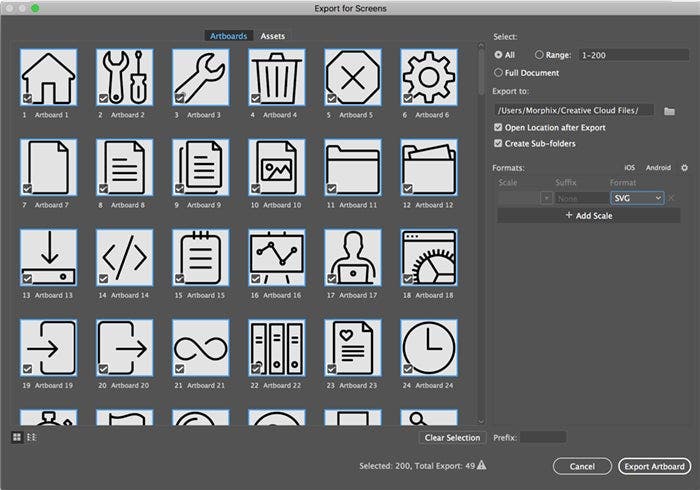 Once you have your icons in place, you can use the ‘Export for Screens’ feature accessible under ‘File’ > ‘Export’ > ‘Export for Screens’. This is the best part of using Artboards. You can export all icons in different sizes and formats. Another great time-saver is that you can export your formats and sizes to subfolders.