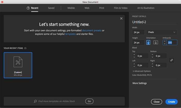 So let’s start with a new Illustrator document with 200 artboards, each sized 24×24 pixels, that will be used as the base document for our icon set/font. With the release of Illustrator CC 2018, you can now, instead of 100, create up to 1,000 artboards in a single document.
