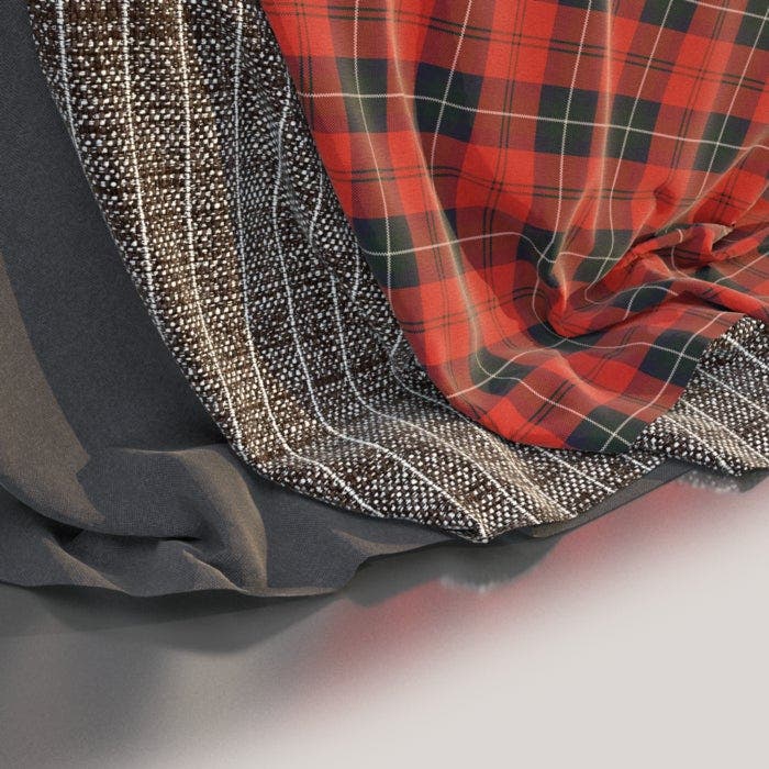 In our next example, we focus on a single continuous color, a soft black, and use this as the connecting point between all three of our fabrics. By combining together rough cotton stripes and an exquisite wool tartan in red, the final composition embodies a rich play of patterns, textures and colors. This great array of patterns could be used on a 3D model like this gift box to create an amazing tabletop scene for the winter season. By adding in some silver bells and a candle in a holder, the design could become a stunning composition of holiday bliss.