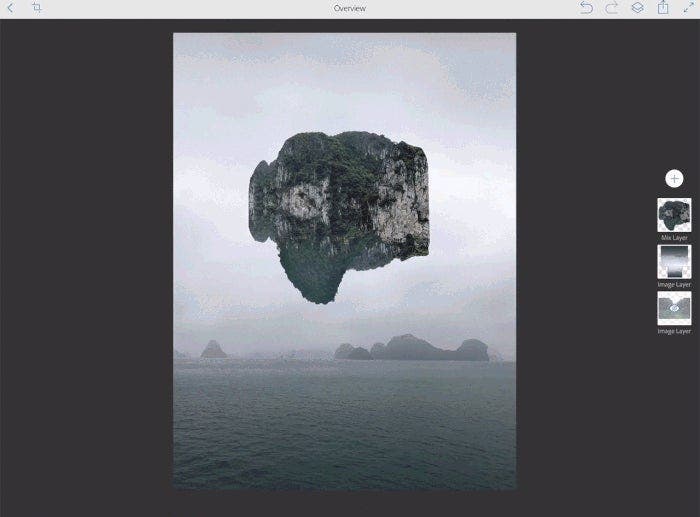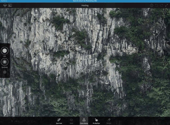 3. Clone Stamp. The Clone Stamp Tool in Photoshop Fix is amazing for retouching photos. It samples pixels from one area of an image and lets you paint those pixels onto another area of the image. I could see some paste lines in my floating island, so I jumped over from Photoshop Mix into the healing panel in Photoshop Fix (accessible under More Tools) and used the Clone Stamp Brush to blend the images together.