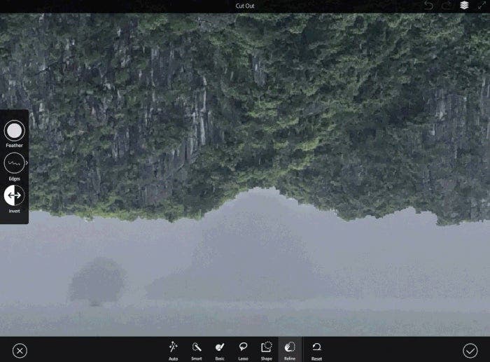 2. Refine Edge (Cut Out). This handy little addition to the Cut Out Panel in Photoshop Mix works beautifully with the Smart Cut Out Option. Typically, when you mask with the Smart Tools, you will get rough edges, which aren’t always what you want. The Refine Edge Tool lets you adjust those edges instantly. In most situations, I would use this to smooth the edges. For this, I wanted the edge to look more like foliage, so I added even more roughness to the edge.