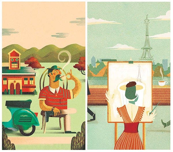 CD: There are so many exciting people out there doing a great job of pushing illustration and design. I follow a lot of illustrators, and it’s difficult to name them all! But here are some to follow: Tatsuro Kiuchi, Tom Haugomat, Steve Simpson, Owen Davey, Malika Favre, Steve Scott, David Doran, Riccardo Guasco, and the list could go on…