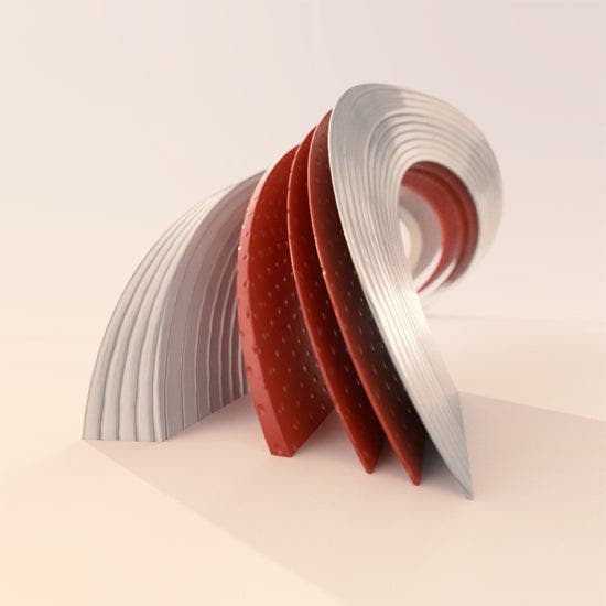 In this example, a soft, simple stripe pattern in bright yellow has been partnered with a cool, blue plastic, and a muted forest green. The complimentary effects of these colors enhance the ebb and flow of each shape — leveraging the differences of these unique materials — while creating a color palette that transitions smoothly from warm to cool tones. These colorful surfaces would be an excellent addition to any product design, such as one using this 3D model of a shampoo and conditioner set. By adding a warm and cool color combination to the bottles and then blending in a dynamic brand logo (as with the work of John Godfrey), a designer is given a new repository of tools to create truly stunning product scenes. For the truly adventurous, add in some abstract splashes in sparkling blue and rich gold — bringing that one-of-a-kind design to life.