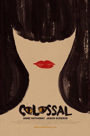 A rough, illustrated style conveys a dark and ominous tone in this movie poster for “Colossal.” Image source: Akiko Stehrenberger.