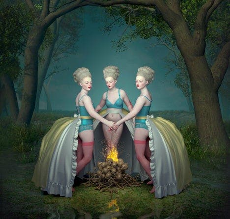 Campfire. “This is inspired by ‘The Three Graces’, but in a more obscure way. My initial idea was to make the girls happy, dancing around the fire, but I ended up more with a ‘witches at night’ feel.”