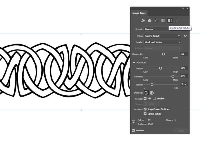 Drag your drawing into an empty Adobe Illustrator document. Open the ‘Image Trace’ panel and select the Black and White tracing style.