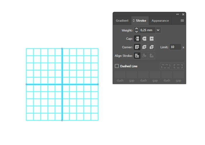 With the ‘Direct Selection Tool’ select the central vertical and horizontal lines while holding Shift, then change the line weight to 0.25mm in the Stroke menu. Your grid should look like the picture below.