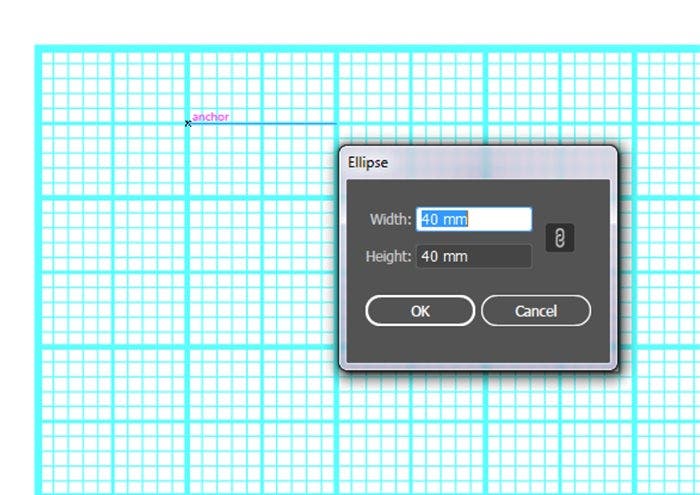 Select the ‘Ellipse Tool’ and draw the circle by clicking on the grid at the intersection of the second vertical bold line and the first horizontal bold line. Set both height and width to 40 mm.
