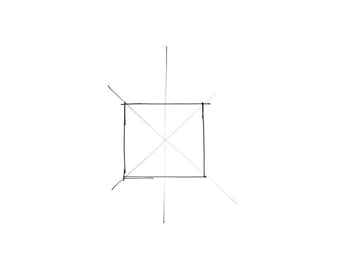 First, draw a square on your canvas, near the middle. We need to figure out the center. The easiest way to do that is to draw diagonal lines using the opposite corners. Where the lines cross is the middle. Draw a line up from that point. This will help us place the head.