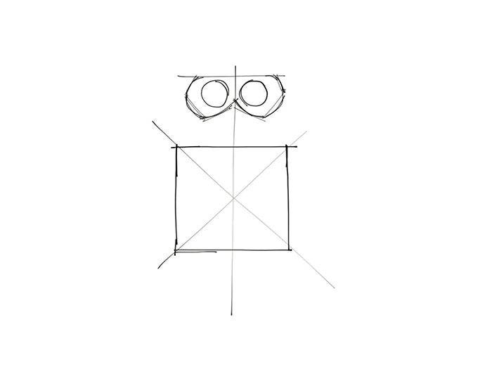 Using our midpoint as a guide, draw the top of his head as a straight line, and place each eye on either side of the centerline. Wall-E’s face has a double teardrop shape, but it’s tricky to get right. I like to draw a wide and sharp ‘w’, and then round it out to get it looking accurate.