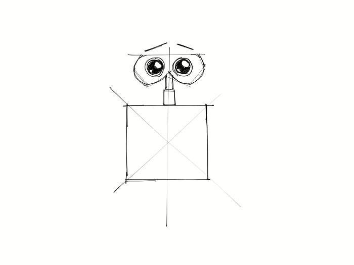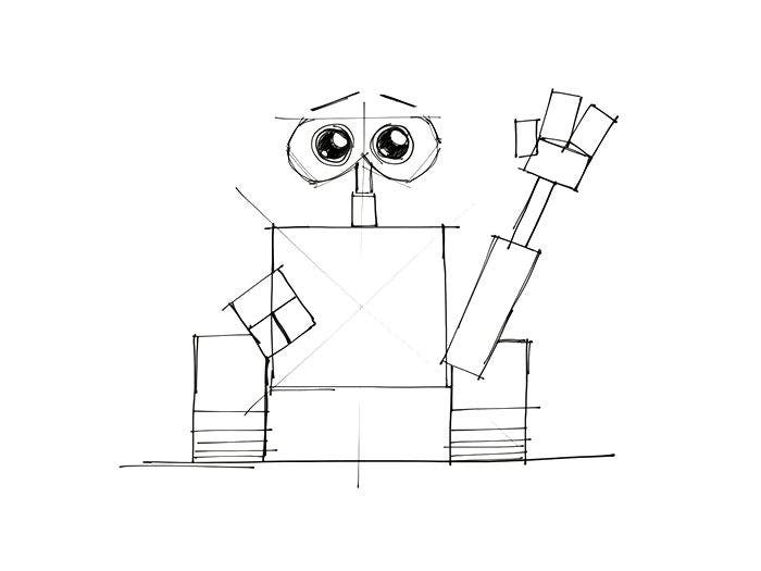 If you’re still looking for a jump-start, we hope this next section will get your creative juices flowing. One of the cutest robots ever created is Pixar’s Wall-E. We were lucky enough to ask Jay Shuster to show us a how to sketch him in just a few simple steps. Jay Shuster is one of the talented artists at Pixar who helped create Wall-E’s adorable look. His words are below, in italics. Check it out: