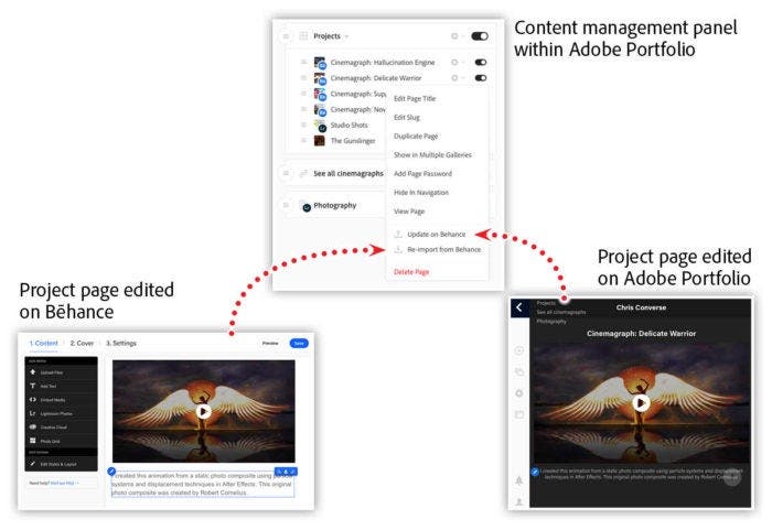 Similarly, if you update a Bēhance page within Adobe Portfolio, you can push those changes directly back to Bēhance. In the Manage Content panel within your portfolio, click on the gear icon for the Bēhance page and choose “Update on Bēhance.” This will synchronize the content from Adobe Portfolio to your Bēhance project.