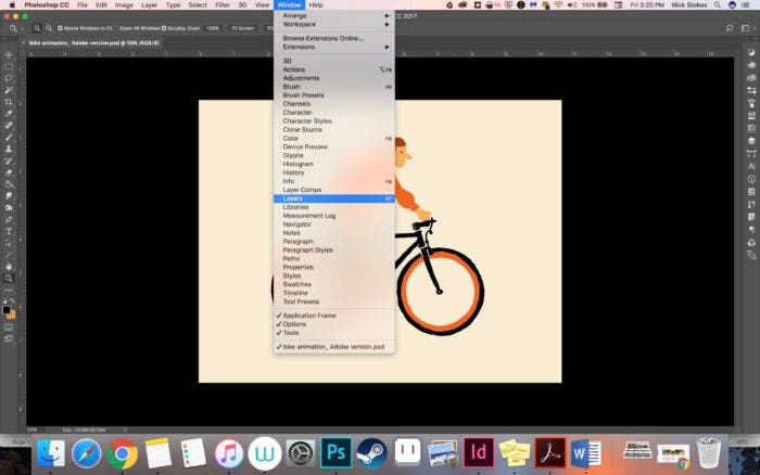 Open up the layers tab in the Window dropdown menu. There you will see all the assets for the animation. Click the “riders” folder to view all the different rider layers. Make sure only “rider 1” is selected (there is an eye in the box to its left when selected).
