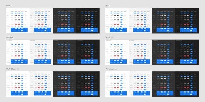 First, the button element has nine variants, and each variant has five states. Each of these needs to work across the 4 color themes we use, from lightest to darkest. That brings us up to 180 permutations. Lastly, we support six platforms_:_ UWP, MacOS, iOS, Android, web desktop, and web mobile. Multiply all of that together, and you get something like this: