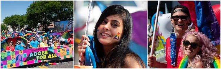 As a culmination for LGBTQ+ Pride Month this year, we had a record number of participants march in pride parades. Over 700 Adobe employees and their family and friends marched to spread the message of love, unity, equality, diversity and inclusion—everything that #AdobeForAll stands for and more! See below for a look at how we celebrated and visit our Spark page to learn more about what Pride means to us.