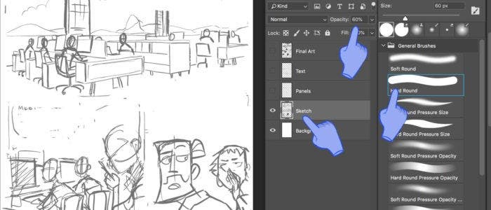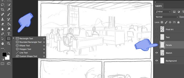 First, open Photoshop and create layers called “Sketch,” “Panels,” “Text,” and “Final Art.”