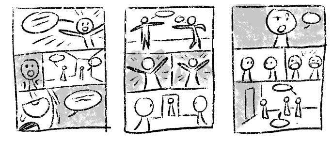 Script, done. Now it’s time for final, beautiful art, right? Wrong. Sit down. We still need to do our thumbnails. Thumbnails are quick sketches to plan your comic pages in advance. They’re a super helpful way to visualize your story without the commitment of fleshed-out drawings. Don’t try to make them the size of actual thumbnails, that’s ridic. But do keep them loose, simple, and to the point. You’ll have time for gorgeous illustrations later.