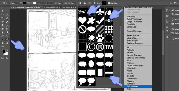 There are great tools for speech bubbles, too. Choose “Custom Shape Tool” and in settings, click “talk bubbles” for an assortment of premade shapes. Boom! You kids have it so easy.